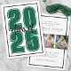 Timeless Vertical Graduation Announcement & Party Invitation. The front features the year "2025" in large bold font, with "class of" elegantly written in script across the middle. This version showcases a classic green, black, and white colour scheme, but all colours—including the year, script text, and frame—can be customized to match school colours or personal preferences. The background colour can also be adjusted for a personalized touch.