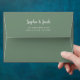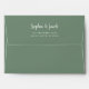 These minimal, solid colour green wedding invitation envelopes feature simple, watercolor green leaves on white inside. Trendy script typography on the back flap (where your names and return address are pre-printed) adds a fresh look to make these envelopes perfect for rustic, minimalist, or any elegant botanical outdoors wedding.