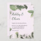 The botanical border, featuring green leaves decorating the top, bottom, and sides, creates a natural and timeless feel that will set the tone for your wedding celebration. The majority of the text is in a stylish dark grey, which perfectly balances the simplicity and elegance of the invitation. The couple's names are highlighted in a dark green that matches the greenery on the border, adding a personalized touch to the invitation.