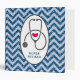 A personalized binder with a title on the spine. Designed with an oval frame and inside is a grey stethoscope, a red heart and a personalized name. Set on a blue chevron pattern with faux glitter. No real glitter, it's just an image of glitter.