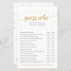 Simple Guess Who white with faux gold splatters baby shower game. You can personalize this game with the guest of honour's name and shower date along with 15 statements/questions. Your baby shower guests will guess who said each statement....mom or dad.