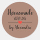 Simple "homemade with love" sticker with a black font on a mellow brown background embellished by a cute red heart. Customize text.