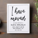Moving announcement postcard: let your friends and family know about your new address with this simple and fully customizable postcard. Choose your favourite colour for the text and background.