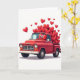 This greeting card shows a classic ruby-red pickup truck angled slightly to the side, with a shiny chrome grille, rounded headlights, and curved fenders. The truck bed is packed with glossy red hearts that spill upward and outward, as if they’re floating into the air. Behind the wheel sits a heart-shaped character with bright blue eyes and a big smile, holding the steering wheel with tiny hands. The background is plain white, which makes the reds stand out and keeps your focus on the truck and the hearts. Each heart has soft shading and a little shine, so the pile looks full and real, like love you can almost touch. There isn’t any printed message on the front, so your words inside get to be the main focus ❤️. It feels meaningful to give because it looks like someone is showing up with care, bringing affection straight to the person they love 🥰.