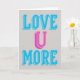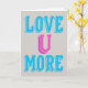 This greeting card centers on the message “LOVE U MORE” stacked vertically down the middle. The background is a soft, neutral gray that helps the words stand out right away. “LOVE” and “MORE” are in bright cyan, while the “U” in the center is a strong magenta that draws your eyes first. The letters look slightly raised with a small shadow, giving the text a gentle 3D feel. Inside the shadows, there’s a tiny dotted pattern that adds texture and a throwback print look. The words are in thick, simple lettering, and the layout feels direct and easy to read. It’s a meaningful card to give because it says exactly what you feel—affection that’s simple, honest, and a little fun 🥰❤️. Hope it helps you share your Valentine’s Day sentiments with someone you care about.
