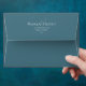 A simple minimalist wedding envelope, this design features a simple minimalist wedding simple minimalist wedding template, rsvp return envelope, minimal black text font, modern calligraphy ampersand names, bride groom monogram names, with classic typography tradition formal, a blue hydrangea matching envelope, teal turquoise blue envelope, response envelope