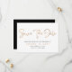 Modern minimalist cooper gold script save the date card. This elegant card features of handwritten script in cooper gold colour on white background and wedding details and names written in capital lettering in black colour. Back of the card is deep black. To edit this template click customize further.
