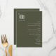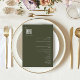Elevate your wedding dining experience with our Simple Minimalist Olive Green Modern Wedding Menu. The chic design, featuring a trendy olive green hue, adds sophistication to your celebration. Order now to showcase your culinary delights in a stylish and modern way, enhancing the elegance of your special day.