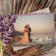 Minimalist photo wedding "Thank You" featuring a single large photo on front with names and wedding date and your unique message and signatures on back. Features a dusky lavender background on back. Template placeholder photo courtesy Unsplash. Design by Holiday Hearts Designs.
