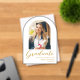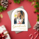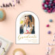 Simple Modern arch graduation announcement card featuring elegant gold script typography on a clean white background with an arch photo of the graduate, name of school, class year and name. Congratulations!