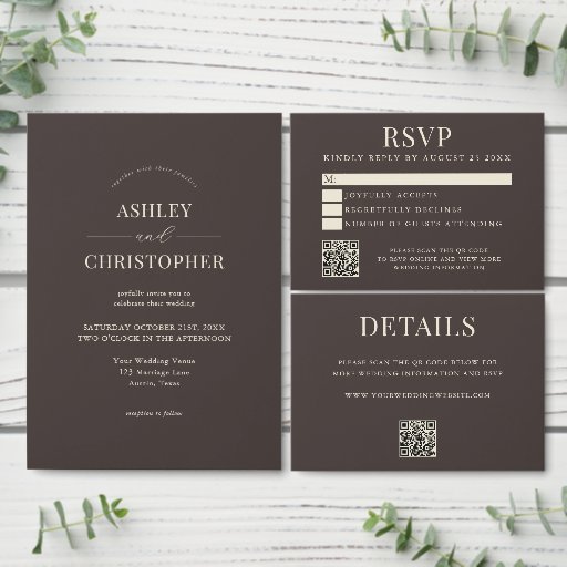 Create your own custom wedding invitations featuring all the details of your special day in simple elegant typography in brown color.