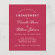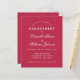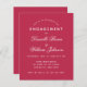 A simple engagement party invitation with a very modern colour, a vivid nuance between magenta and red. It has only white text on magenta / red background. The names are written in an elegant calligraphic script, the rest in caps. the first line is arched text.