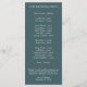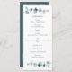 A chic and modern program card is framed with minimalist eucalyptus branches. The back lists the wedding party against a rich green background.