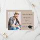 On front: Add your own vertical size photo of the graduate. A trendy mocha, beige colored background, black text. Templates for a name and date. The name is written with a modern hand lettered style script. With a cap, tassel topper.