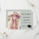 On front: Add your own vertical size photo of the graduate. A trendy muted sage green background, black text. Templates for a name and date. The name and the text: Save the Date are written with a modern hand lettered style script. With a cap, tassel topper.