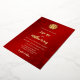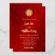 This minimal Chinese wedding invitation features a real gold foil double happiness symbol on a floral ruby red shimmering background. Bride and groom names in an elegant handwritten script. Chinese wedding invitation or tea ceremony invitation.