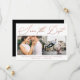 Simple faux rose gold "save the date" calligraphy script with two photos and a black back, modern and minimal save the date card.