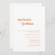This simple, modern wedding invitation features a copper orange and white colour palette, a bold serif font for the couples' names, an elegant and classy sans serif font for the wedding invitation text, and a charming hand-written script font for a touch of extra elegance.