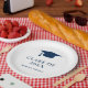 Modern graduation paper plate featuring a simple and masculine design with "Class of Year" in large bold typography along with a grad cap and the graduate's name in navy blue over a white background. These paper plates are perfect for a guy graduate and are a great way to add a personal touch to your graduation party.
