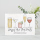 This design features a watercolor simple new years eve day, party champagne wine celebration festive, a martini mixed drinks vodka chardonnay, trendy stylish gold bubbly toast, watercolor champagne flute glasses glass, an elegant calligraphy script text font, a whimsical typography style design, modern Christmas holiday glitter, classy-vintage retro cute simplistic, a family friends get together party