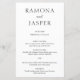 Un menu de mariage élégant, au design simple et minimaliste. Une disposition classique avec vos noms en gros caractères pour une touche moderne à ce style traditionnel. Ce design noir et blanc peut être modifié à n'importe quelle couleur que vous choisissez dans l'outil d'édition de conception. Un menu mariage qui conviendra parfaitement à un mariage formel.
