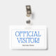 This simple badge design features the message "OFFICIAL VISITOR!", and a customizable company name or other custom message. It also features a single-line border. A badge like this could be used to identify that somebody at a workplace or business is an authorized guest/visitor. [~Z0000307]