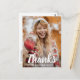 Modern graduation thank you postcard featuring a text overlay with "Thanks" in a thick script along with the graduate's name over your favourite full bleed photo. The backside has your personalized message and return address in black over white. This simple graduation thank you postcard is perfect for a girl high school graduate and is a budget friendly option.