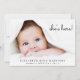 Simple photo birth announcement to announce the arrival of your baby to family and friends. Your newborn's photo fills the front and is overlayed with "she's here!" "he's here!" or "I'am here!" in a contemporary script (you can move this text to another area on the card to suit your photo by selecting editing in the design tool). Add his or her name, arrival date and birth stats. On the reverse side, add four additional photos, a "welcomed by" message and the parent's and sibling's first names.