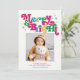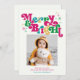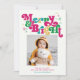 These retro 5" x 7" retro photo holiday cards feature the bright and colourful greeting, "Merry & Bright," in magenta, green, blue and gold and an editable greeting, "Wishing you peace, love & joy this holiday season," with a placeholder for your favourite photo, and your family name(s).