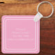 This simple and modern monogrammed keychain has a minimal monogram that you can personalize with your choice of initial on the front and contact information on the back in pretty pink and white.