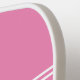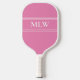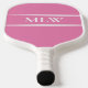 This pink pickleball paddle has three white letters in the centre. You can change the letters to display the correct monogram. Two white horizontal lines are above and below the initials.