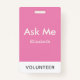 Simple pink personalized "Ask Me" badge for volunteers, teachers, guides, event organizers for special events, such as weddings, craft fairs, home & garden shows, charitable events, business and corporate functions. “Ask Me” and Name are an ivory colour. “Volunteer” title is dark grey.