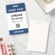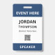 Practical no nonsense event ID badge personalized with name, company, role, and QR code in dark blue.