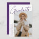 Modern graduation announcement card featuring one of the graduate's photos on the front with "Graduate" in a purple handwritten script with a white background. Personalize with the graduate's name, school name, and graduation year. The minimalist graduation announcement reverses to display 4 photos in a grid-style layout with the graduate's future plans or other custom text shown below. The 5 photo graduation announcement is perfect for both high school and college graduates.