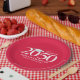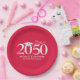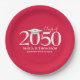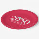 This design features a graduation party paper plate, with a red and white theme, a graduate grad hat, and a class of, with brush script calligraphy, with typography, in a simple minimalist, modern, minimal, mortarboard graduation hat design.
