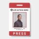 Basic photo ID badge in a vertical layout with a simple yet professional design featuring a red border on the top and bottom. The template is personalized with your logo, press publication name, employee name, and title. The bottom border has "PRESS" in large bold letters and may be changed to any title desired. The backside has your contact information and instructions for returning if found. This classic press pass is great for all news station field staff.