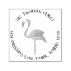 This design features a return address with a circle text font self-inking stamp with a tropical pink flamingo nature bird and a simple minimalist typography style, great for a beach house on coastal island in Florida, a stylish trendy chic cute festive design, a fun whimsical animal nature, stylish unique mailing supplies, a mailing stationery envelope stamp, a creative chic simplistic modern, great for beach sand tropics cottage