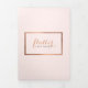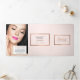 A calligraphy font in a rose gold hue spells out your name or business name with swooping tails and delicate curves while being framed in a faux metallic rose gold box for extra glam on this 5x7 tri-fold brochure. Created for eyelash extensions salons, makeup artists, hair stylists, cosmetic companies, beauty specialists and more - these smaller sized brochures are perfect to display your price lists and menu of services. A great marketing piece to hand out to potential clients to quickly introduce your business. Please contact the designer for help with special typesetting or layout variations. Art and design © 1201AM Design Studio | www.1201am.com