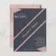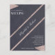 A contemporary geometric design featuring rose gold shapes. A marble effect in the pink shapes adds a touch of elegance. With a combination of modern fonts and an elegant wedding script for the bride and groom's names. A faux textured deep blue grey background gives this an exclusive look.