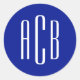 Modern three letter monogram design in white on solid royal blue round stickers.