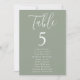 Modern wedding seating chart featuring "Table" displayed in a white script with the table number and guest names shown below on a sage green background. The design repeats on the back. To order the table number seating chart, edit each card with the table number and guest names and add it to your cart. Designed to coordinate with our Simple Script wedding collection.