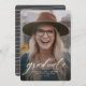 A simple classic script "graduate" in white accentuates a single vertical photo of your grad. This graduation announcement works for both college or high school graduates and is simple enough to let your photo shine. It's a timeless design and also features a striped backer with a customizable colour (default is charcoal grey).