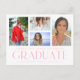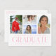 Simple Script Multi Photo Graduation Announcement Postcard features four of your favourite photos of your college or high school graduate on the front with the elegant modern pink calligraphy script "Graduate" overlay. Personalize with a message on the reverse. Simple, stylish and classy. Created by ©Evco Studio www.zazzle.com/store/evcostudio