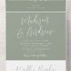 Modern wedding invitation featuring your monogram initials, names, and wedding details in a simple white script with a sage green background. The sage green all-in-one wedding invitation includes an RSVP postcard.