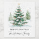 Cute Christmas wine label for Christmas gifts with simple script family name and a watercolor vintage Christmas tree with snow.