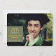 A modern minimalist 2-in-1 graduation announcement photo card and grad party invitation design featuring a simple flat-coloured square box on a full bleed photo of the graduate.