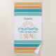 Celebrate summer vacations or a girl’s beach get-away with this fun beach towel that features a simple illustration of the sun and ocean waves, bold tropical coloured stripes, and two customizable text placeholders. Add a name plus additional text go create a fun keepsake that will bring back happy vacation memories each time you reach for this towel.