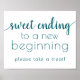 Luxurious turquoise aqua blue, aquamarine, seafoam, and white horizontal "Sweet Ending to New Beginning" shower, party, or reception table signage featuring a fun, casual hand-lettered script. The classic design includes a modern handlettered quote typography overlay. The lovely font with a customizable background color makes it easy to fit any theme. For other colors or matching products, please visit the JustFharryn Zazzle store, or contact the designer, c/o fharryn@yahoo.com All rights reserved. #zazzlemade