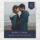 Simple traditional typography, photo tag, wedding save the date wine labels. Design features, single horizontal photo, white typography and navy blue colour background.
