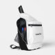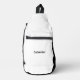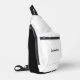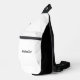 This white crossbody sling bag has text in black script. The text can be edited or deleted.